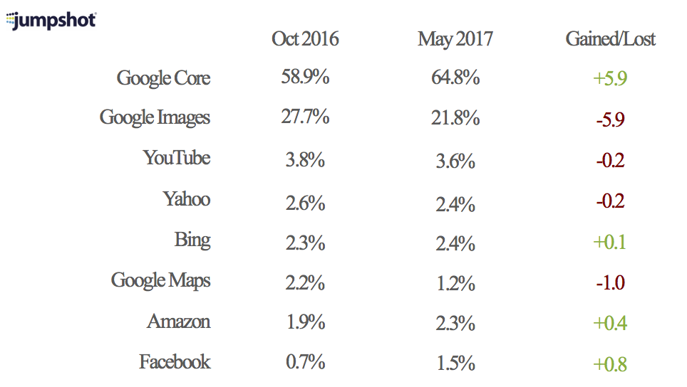Los productos de Alphabet (Google, Youtube) representan el 91% de las búsquedas totales, y pese a que nuevos actores han crecido (Amazon, a través de Alexa, y Facebook), siguen siendo dramáticamente inferiores en porcentaje.