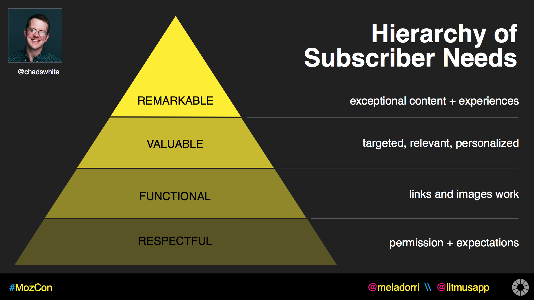 Ningún canal debe tomarse como una unidad autónoma ni mucho menos planear las estrategias y tácticas de forma independiente o exclusiva. E-mail marketing, uno de los canales más eficaces, no debe relegarse a un segundo plano. Justin Jordan compartía las jerarquías de necesidades de un suscriptor: ser respetuoso con los envíos, que sean funcionales, valiosos y remarcables.
